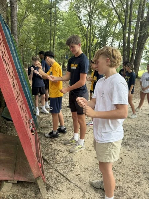 In early August, the freshman class of ’29 had a blast on their annual retreat to Butter and Egg Adventures in Troy, Alabama. Although the weather proved to be a challenge at the beginning of the day, the freshman didn’t allow that to dampen their high spirits and utter excitement. The day started off with group based activities in which the students were divided into three different groups based on their advisory classes. Each station consisted of different team building activities and challenges. These survivor inspired series of obstacles were part of the outside course. The freshman got to participate in word puzzles, ring and bean bag toss, and the thrilling minefield challenge. The minefield challenge was very entertaining to watch, because the freshman struggled quite a bit at the start and really had to come together to solve the puzzle. The rules stated that only one person could be in a section at a time while the collective group held hands to make it to the other side. Many giggles were shared between the freshman, peer leaders, teachers, and our Butter and Egg guide as the freshman had to problem solve ways to navigate the string course in order to get across.