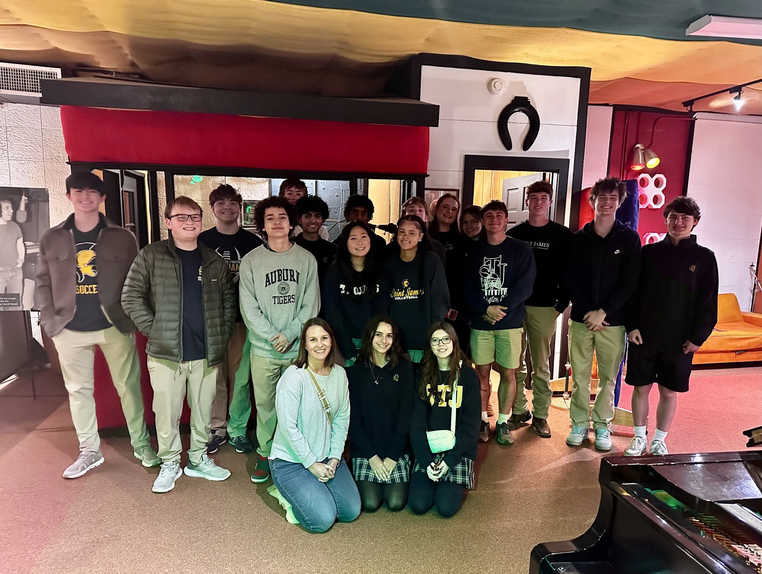 On an early and frigid morning, both current and past History of Rock and Roll students joined Dr. York and Mr. Harrison on a four-hour bus ride to Muscle Shoals, AL. What seems like a random small town is actually an epicenter of rock history. From the Rolling Stones, Bob Dylan, and Aretha Franklin, to Demi Lovato, Chris Stapleton, and Alicia Keys, tons of artists recorded parts of their famous discographies in this town. There is a musical magic in Muscle Shoals, and we had to experience it firsthand.